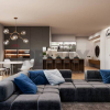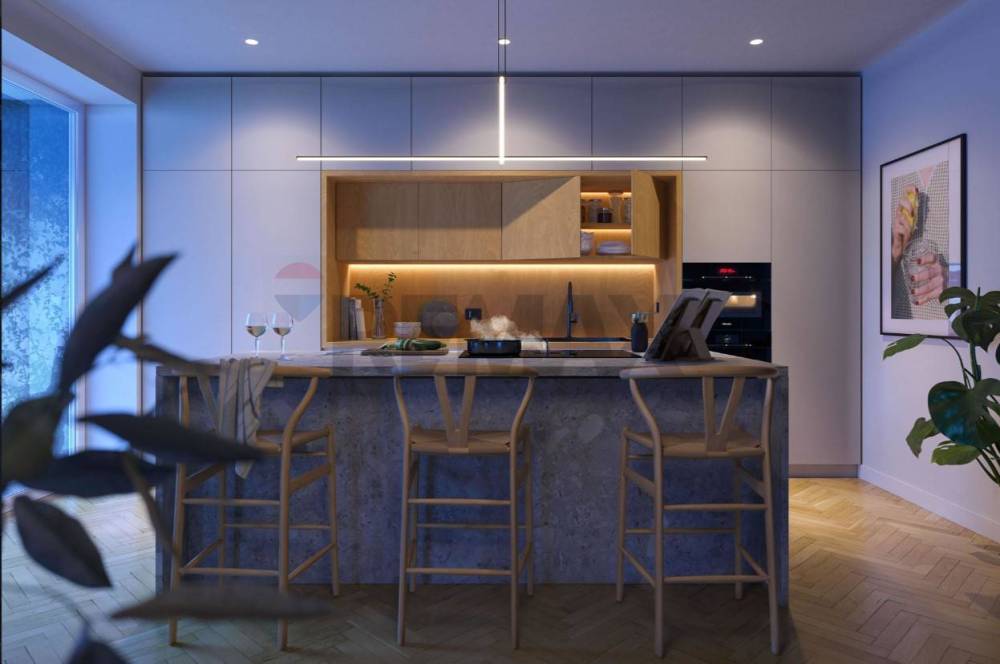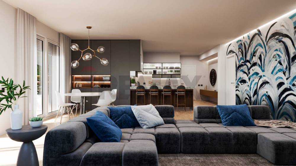 Lingresso introduce alla zona living di grandi dimensioni, con spazioso angolo cottura e ampie vetrate che illuminano naturalmente tutti gli ambienti, creando unatmosfera calda e piacevole.