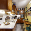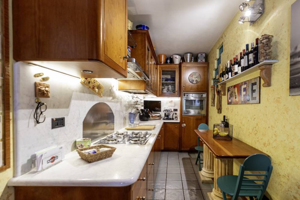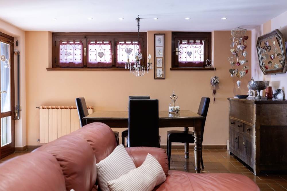 Allo stesso piano troviamo la cucina semi-abitabile, comoda e funzionale e salendo due scalini, un bagno e la zona pranzo - soggiorno con caminetto, perfetto per chi desidera lasciarsi avvolgere dal calore della fiamma mentre cena o si rilassa seduto a tavola, grazie alla sua suggestiva vista laterale.