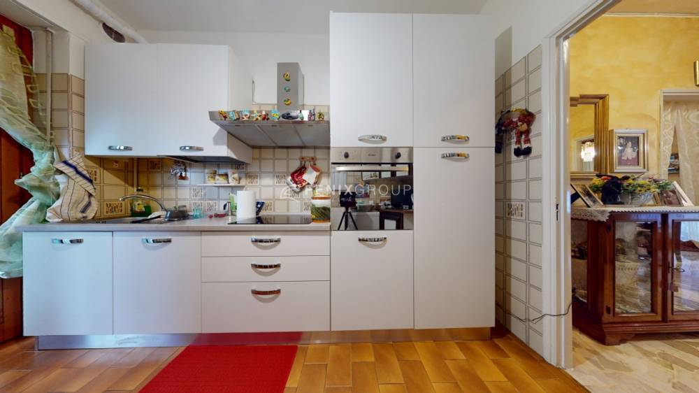 L’appartamento si compone di un ingresso su disimpegno che conduce, sulla sinistra, alla cucina abitabile con balcone ed esposizione a sud, mentre sulla destra si accede al soggiorno, dotato di porta finestra ed esposto a nord. Proseguendo dal disimpegno si entra nel corridoio, dove si trovano un comodo ripostiglio, il bagno finestrato con box doccia e sanitari sospesi, anch'esso esposto a sud e la camera da letto con balcone, dotata di split per l'aria condizionata ed esposizione a ovest.