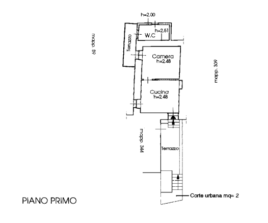 L'abitazione è al primo e ultimo piano di una casa a schiera ed è suddiviso in ingresso sul locale cucina e una camera comunicante.