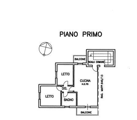 L'immobile è posto al primo piano ed è composto da: cucina-soggiorno, disimpegno, bagno e due camere da letto.