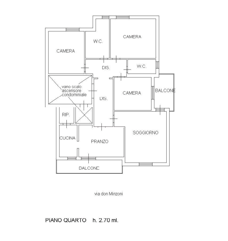 La residenza è composta da disimpegno di ingresso, soggiorno con balcone, cucina/pranzo (dotata di caminetto) con ripostiglio oltre a balcone, disimpegno notte, due servizi igienici e tre camere.