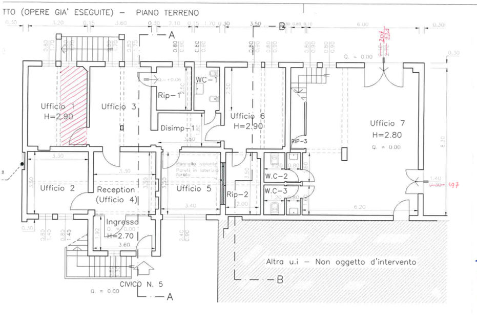 L'unità a uso ufficio ubicato al piano terra, composta da un ingresso, una reception, cinque locali uso ufficio, un disimpegno, un wc ed un locale ripostiglio, a detta porzione del piano terra si giunge attraverso un'area cortiliva. Sempre a detto piano ma non collegati con i restanti vani del piano terra è presente un locale ufficio con due wc e relativi antibagni e scala interna che porta ai locali del piano primo. Al piano primo si arriva attraverso una scala esterna e terrazza sempre passando dall'area cortiliva antistante, a detto piano sono presenti 5 locali ad uso ufficio, due disimpegni, due wc con anti bagno, un bagno ed un locale doccia oltre alla scala interna che porta al piano terra. Al piano interrato è presente un locale deposito/cantina, con accesso da una scala esterna che dal piano terra conduce all'interrato con soprastante copertura.