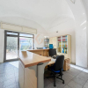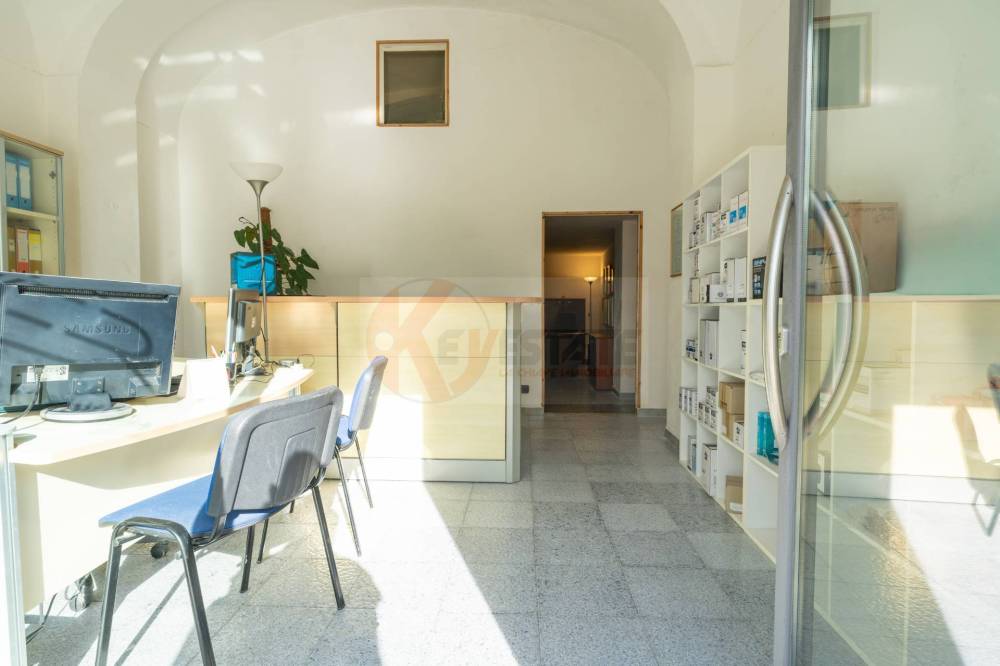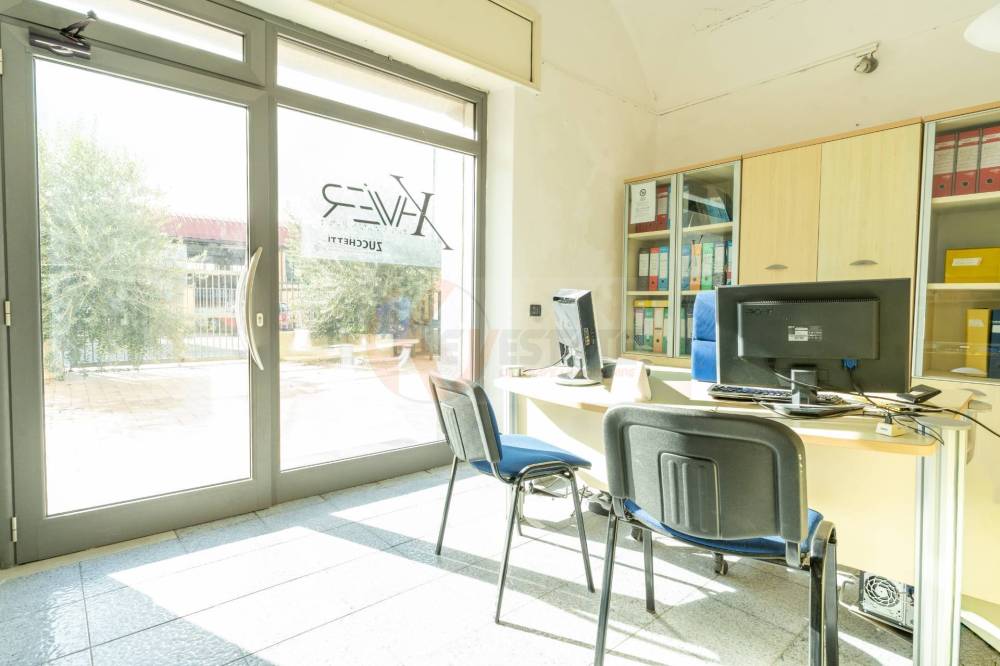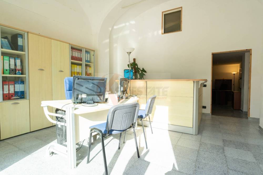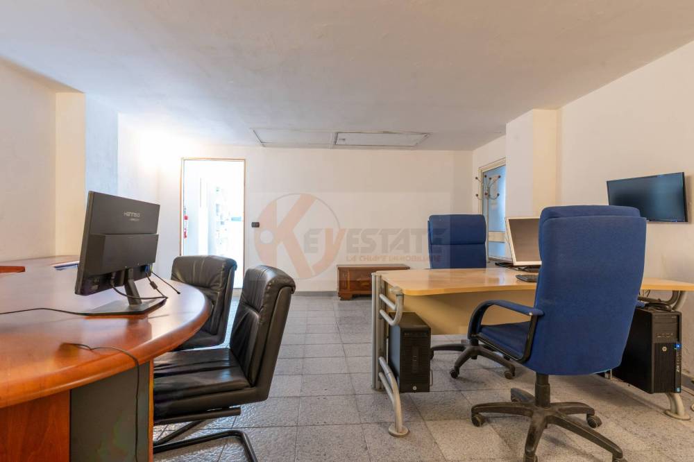 Il locale prosegue con un secondo ambiente regolare, oggi utilizzato come ufficio, in grado di ospitare comodamente due postazioni di lavoro con grandi scrivanie. Completano la proprietà un ampio antibagno, ideale anche come spazio deposito, e un bagno finestrato completo di servizi.