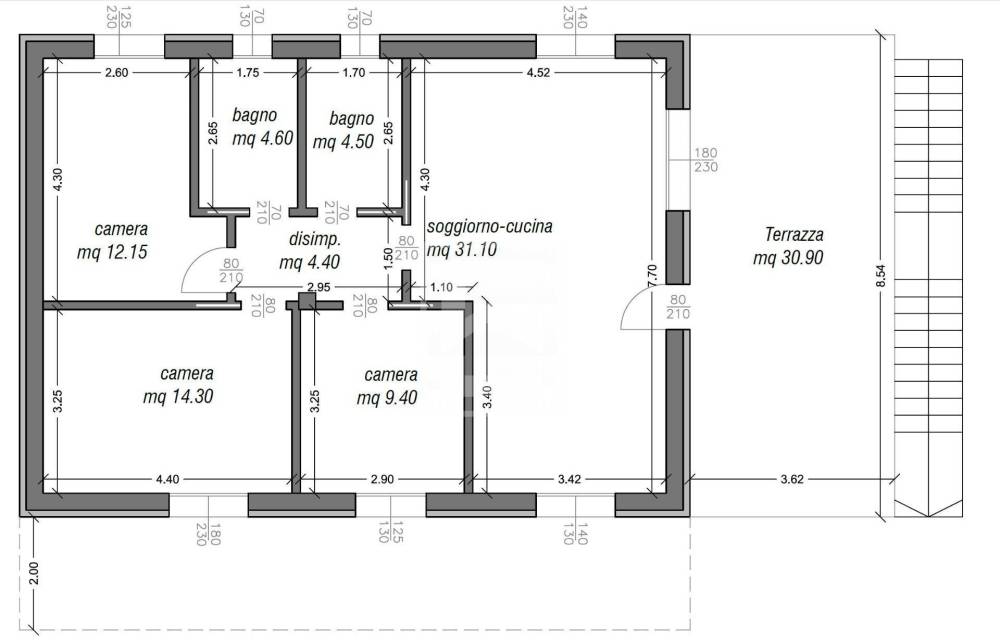 L'appartamento 1P di circa 103 mq sarà ubicato a piano primo, libero su 4 lati e si comporrà come segue: ampio soggiorno con cucina, disimpegno, 2 bagni finestrati con doccia e 3 camere (di cui 2 matrimoniali). Completerà la proprietà garage esclusivo a piano terra di circa 31 mq e giardino privato di circa 55 mq (lordi 86 mq).