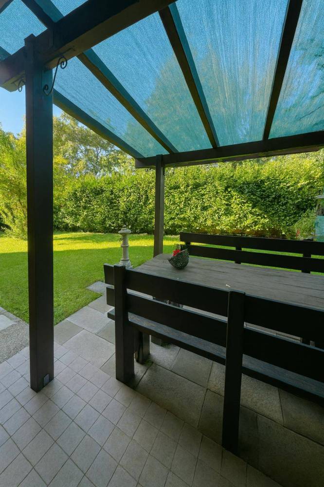 Piano terra (82 mq): soggiorno luminoso con accesso diretto al giardino privato di 175 mq con pergolato in legno, cucina a vista, disimpegno, due camere matrimoniali, bagno finestrato.
