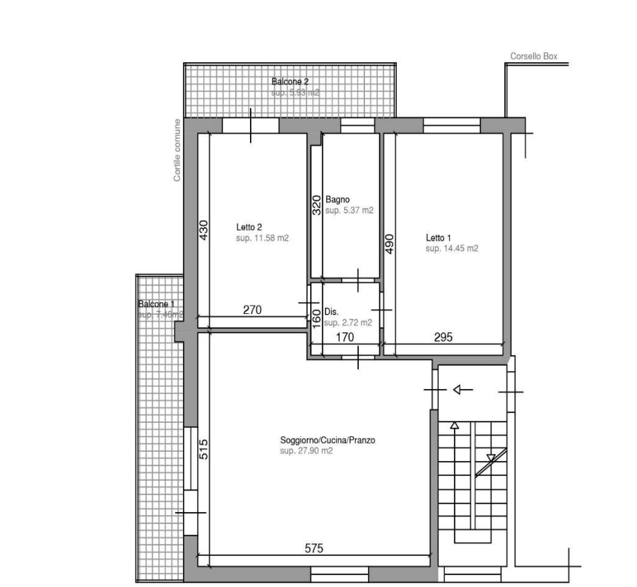 Trattasi di appartamento al piano primo composto da tre locali oltre accessori (vano soggiorno/cucina/pranzo, disimpegno, due camere, bagno, due balconi di 4,29mq).