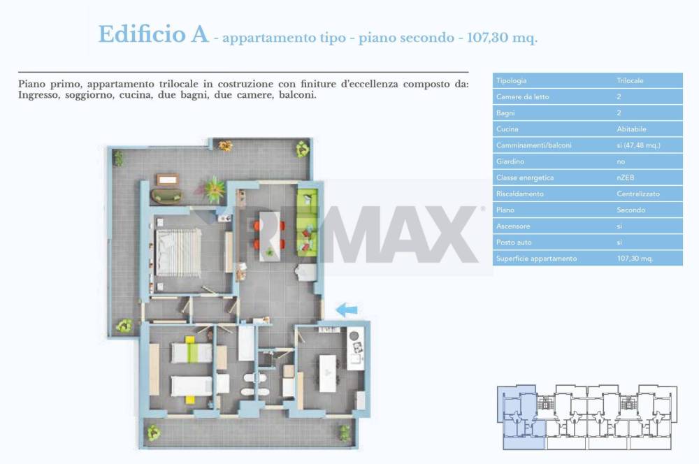 79,62 mq ingresso/soggiorno/angolo cottura, 2 camere, 1 bagno, 1 ripostiglio, 2 balconi da 28,03 mq