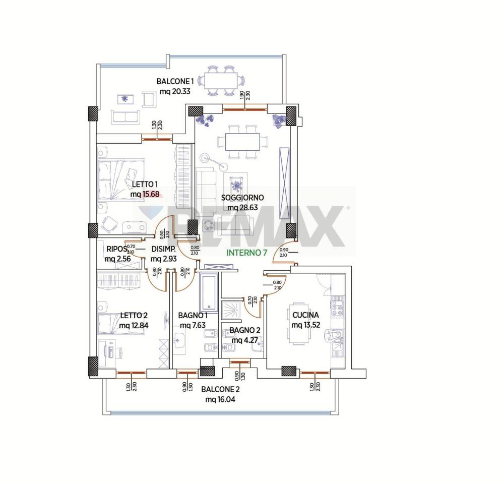 79,62 mq ingresso/soggiorno/angolo cottura, 2 camere, 1 bagno, 1 ripostiglio, 2 balconi da 28,03 mq