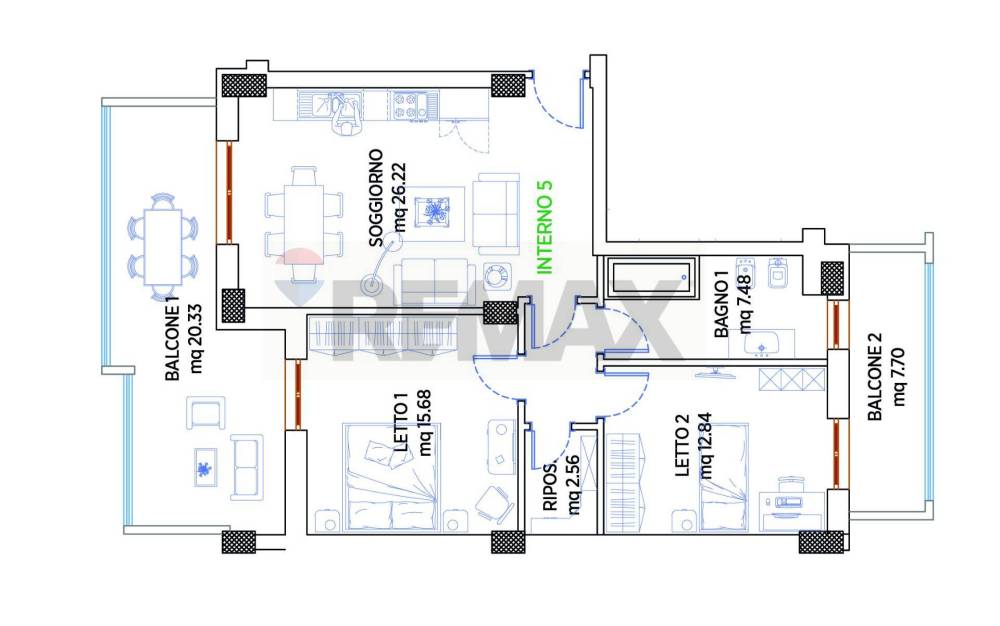 103,75 mq ingresso/soggiorno, cucina abitabile, 2 camere, 2 bagni, 2 balconi di 36,37 mq