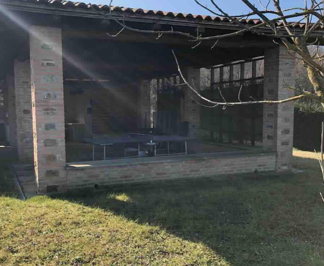 Una piscina interrata, un edificio, un secondo edificio adibito a portico con