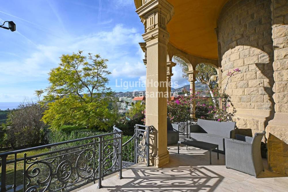Sanremo, prestigioso appartamento in vendita all'interno dell'elegante Castello Devachan, con terrazza, giardino privato, vista mare e garage.