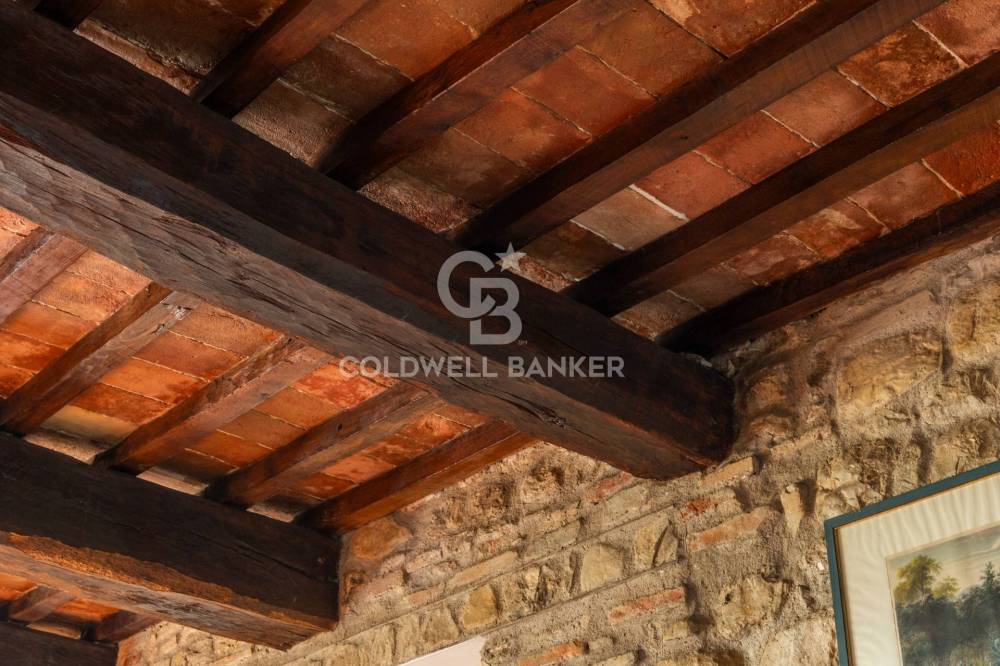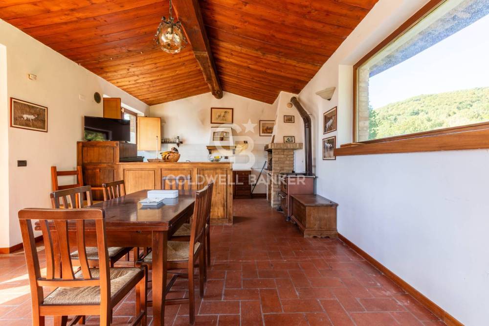 Gli interni conservano con eleganza i tratti più caratteristici della tradizione umbro-toscana: travi in legno a vista che attraversano ogni ambiente, pavimenti in cotto e murature in pietra nella zona giorno che raccontano il passato con calore. Il parquet nella zona notte restituisce una sensazione di intimità e comfort.