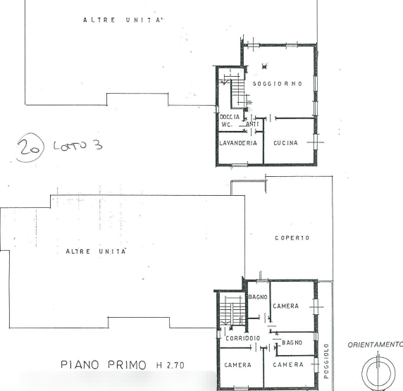 Unità che si aumenta su più livelli facente parte di un edificio residenziale; Al piano terra sono presenti: un ingresso-soggiorno, una cucina, una lavanderia, un bagno, un disbrigo (circa mq 2) e scale interne. Al primo piano sono presenti: scale interne, un corridoio, tre camere, un bagno finestrato, un poggiolo (mq 16,00) verso ovest.