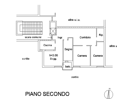 soggiorno con accesso al balcone, due camere, bagno, ripostiglio.