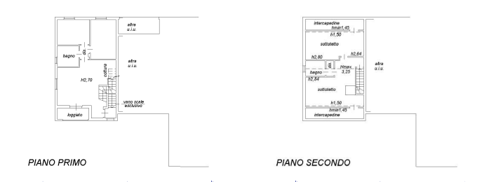 L'unità abitativa è composta da cucina-soggiorno, bagno, disimpegno, due camere e loggiato, al piano primo; due locali sottotetto, bagno, disimpegno e intercapedini, al piano secondo, con annessa cantina al piano interrato, alla quale si accede attraverso scala interna di proprietà esclusiva.