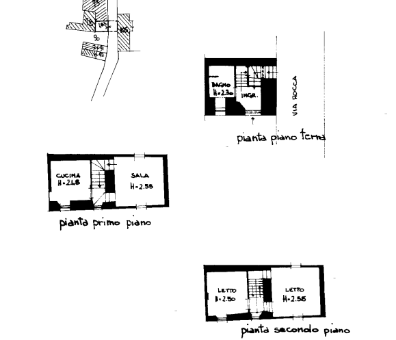 Porzione terra-tetto con piccola area cortiliva. L'unità è composta al piano terreno da ingresso con doppio accesso dalla pubblica via e servizio igienico; al primo piano da cucina e soggiorno; al piano secondo da due camere da letto; all'ultimo piano due locali destinati a soffitta.
