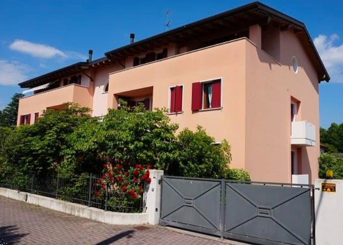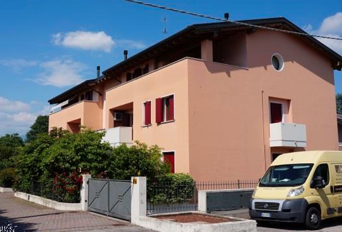Appartamento al piano primo con annessa autorimessa facenti parte di condominio con ascensore, situato a Rossano Veneto (VI) in via Tenente Zanon, composto da un ingresso, una cucina-soggiorno, disimpegno, due camere da letto, un bagno, loggia ad ovest e terrazzo a nord.