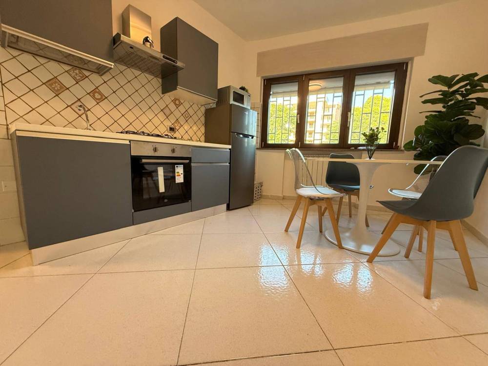 Luminoso salone con angolo cottura completo di elettrodomestici,