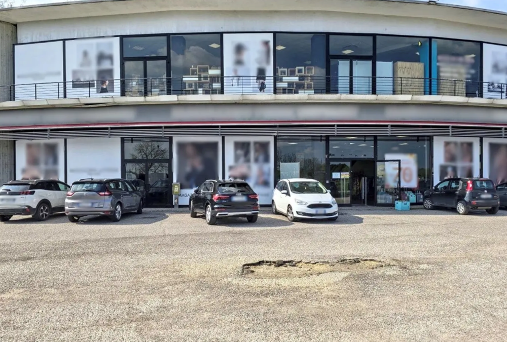 Locale commerciale su due livelli comprensivo di un negozio adibito a showroom, un reparto sartoria ed un magazzino situato a Monselice (PD) in via Silvio Travaglia. Al piano terra, il negozio è dotato di cabine di prova e servizi igienici, con accesso al piano superiore tramite scala mobile, scala fissa e ascensore. Il piano primo ospita una porzione del negozio adibita a showroom, un reparto sartoria ed un magazzino. Gli spazi comuni includono un'area esterna per passaggi, piazzale di manovra e parcheggio auto, oltre a una rampa carrabile.