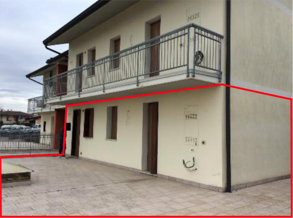 Appartamento al grezzo avanzato al piano terra con corte esclusiva e garage al piano interrato situato a Sarego (VI), frazione di Monticello di Fara, in via Giovanni Paolo I, composto da soggiorno con angolo cottura, due camere da letto, bagno e terrazza, oltre disimpegno che collega i vari locali.