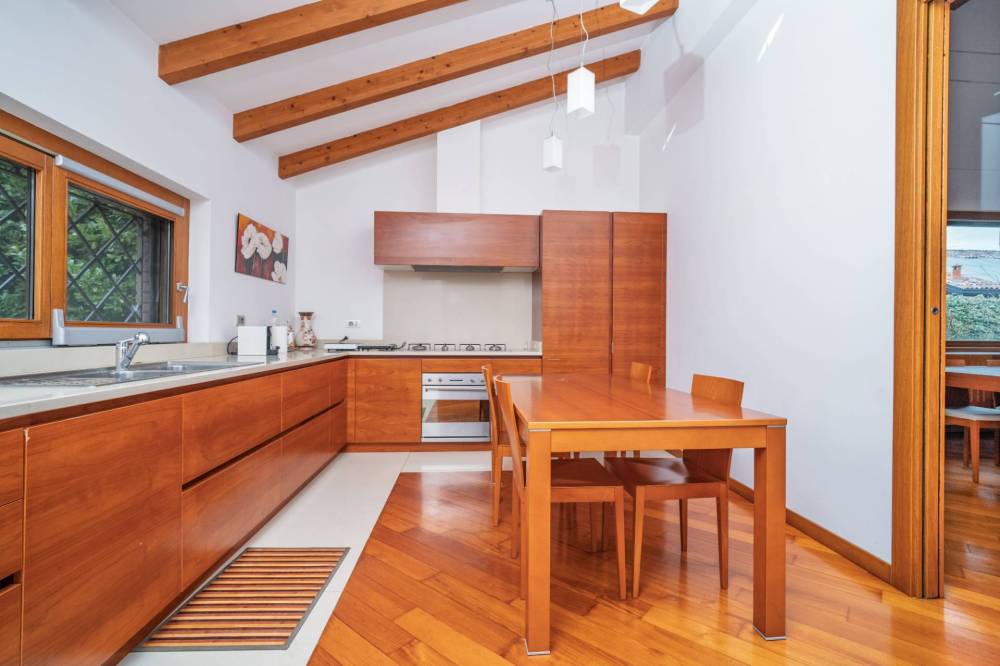 La villa è completata da dotazioni di livello, tra cui parquet, riscaldamento a pavimento, tapparelle motorizzate, inferriate retrattili a scomparsa, impianto d’allarme, porte blindate, videocitofono e cancello elettrico. Presenti inoltre filodiffusione con impianti separati tra taverna e piani superiori e impianto di aspirazione centralizzato con punti di presa su ogni livello.