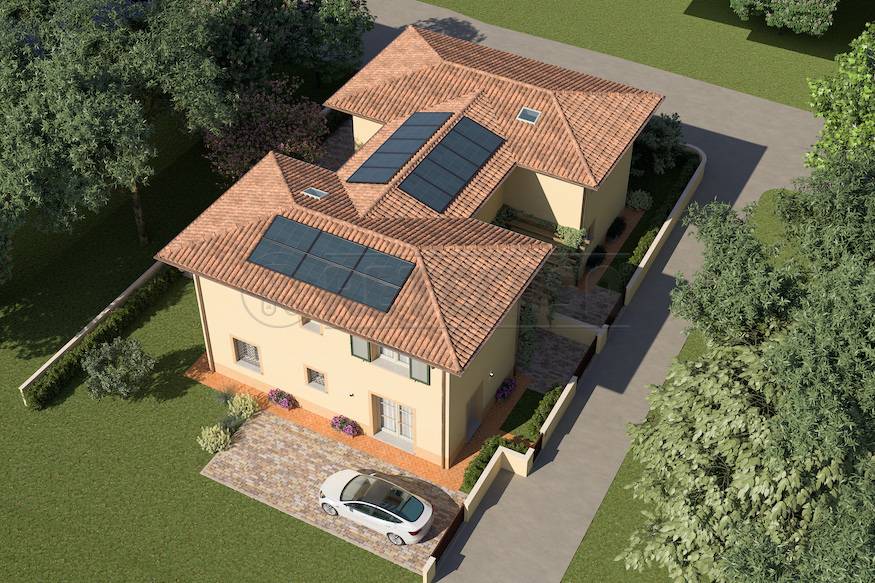 S. Maria a Monte Ponticelli ESCLUSIVA Nei pressi del centro ma pur sempre in zona riservata e tranquilla, realizzazione di Villa bifamiliare su progetto e pronta per Primavera 2027, ovviamente con possibilità di personalizzazione, composta da ingresso dal giardino privato che circonda la casa, nell'ampia zona giorno dove troviamo l'ampia sala e la zona cuna-pranzo otre alla lavanderia ed al 1° bagno; attraverso le comode scale si raggiunge il 1° piano dove troviamo le 2 camere matrimoniali di cui una con ripostiglio o possibile bagno privato, una camera media ed il 2° bagno. Nel giardino vi sono vari posti auto ed una predisposizione per un bel loggiato. Costruite con le più moderne tecnologie edilizie in materia di risparmio energetico, comprendenti pannelli fotovoltaici e solari oltre riscaldamento a pavimento e pompa di calore, cl. energ. A/4, Ipe=38, € 375000 Rif. 896759-5