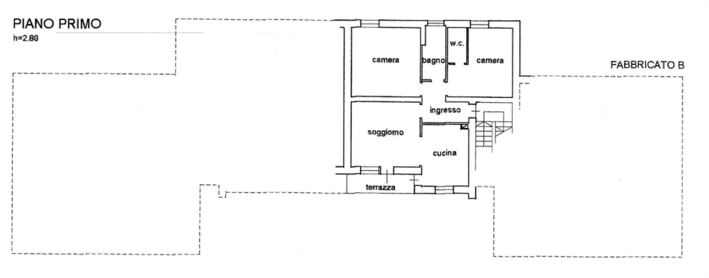 composto da entrata-disbrigo, un soggiorno, una cucina, due bagni di cui uno cieco e uno finestrato e due camere da letto. È presente una terrazza di 4,90 metri quadri ed al piano terra è ubicato un magazzino di circa 9,10 metri quadri.