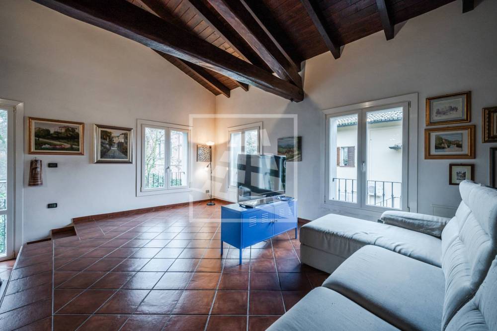 L'abitazione si apre su un luminoso salone di circa 82 mq, caratterizzato da un suggestivo soffitto in legno con travi a vista alto 5 metri e un accogliente pedana rialzata, attualmente dedicata alla zona living; completano la zona giorno una cucina abitabile in muratura, un antibagno e bagno finestrato.