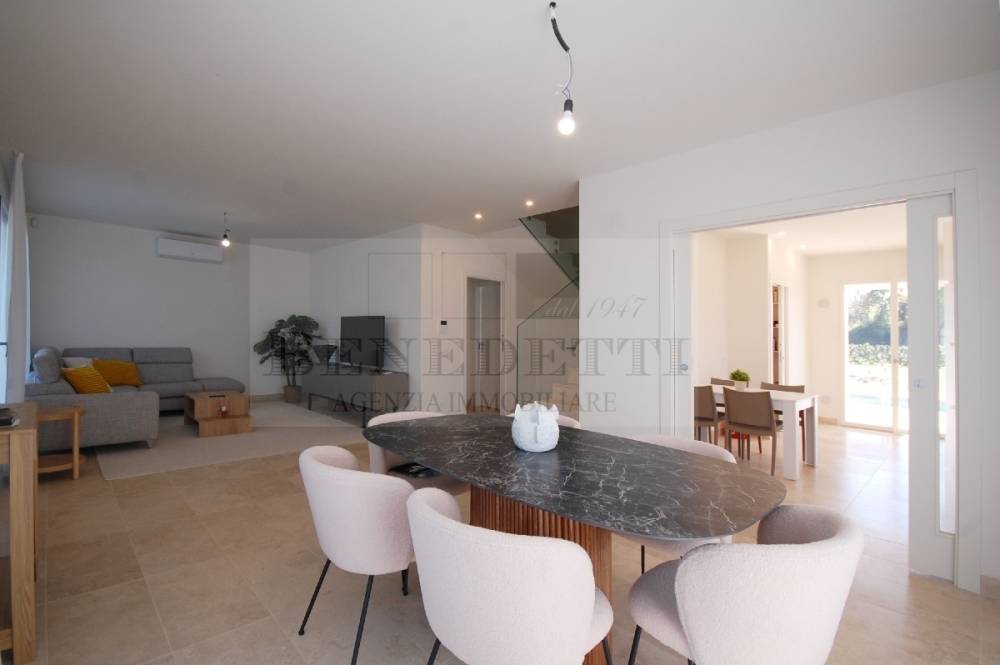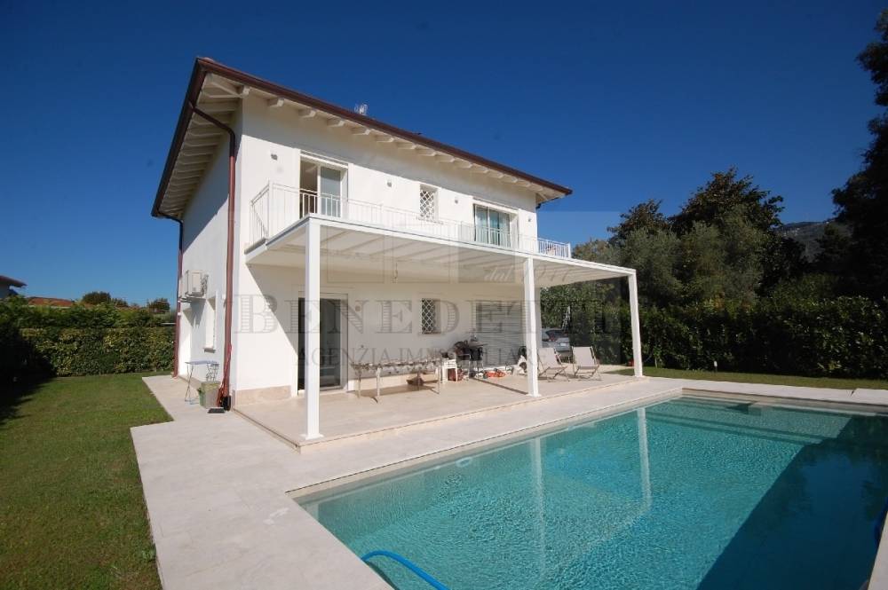 Pietrasanta, primissime adiacenze Centro: confortevole Villa singola di nuova ed elegante costruzione, corredata da ampio giardino privato ( oltre 1.000 mq ) e piscina privata. La villa in PRONTA CONSEGNA, è dotata di tutti i confort ed è realizzata in classe energetica A4. La superficie complessiva della villa sfiora i 200 mq ( interamente fuori terra ) e si compone di ingresso, soggiorno doppio, cucina abitabile, dispensa, camera matrimoniale con bagno esclusivo, altro servizio, a piano terra; al piano primo due camere matrimoniali dotate ciascuna di bagno privato e una suite esclusiva con vano armadi e bagno. La proprietà è corredata da balconi, ampia e luminosa veranda prospicente la piscina oltre vari posti auto interi alla proprietà. Maggiori dettagli in Agenzia