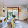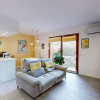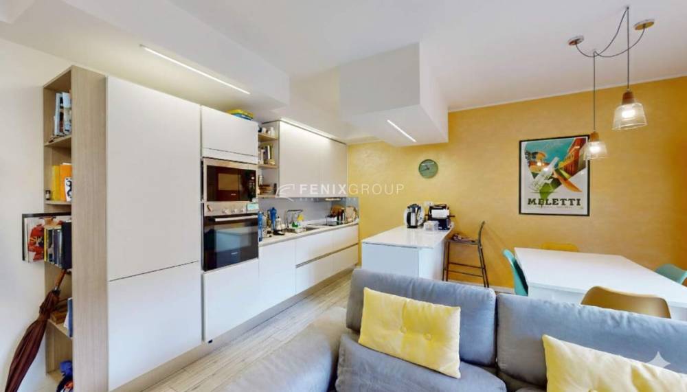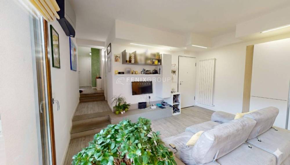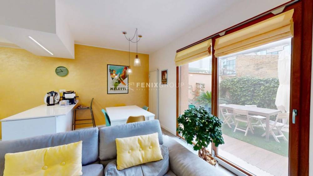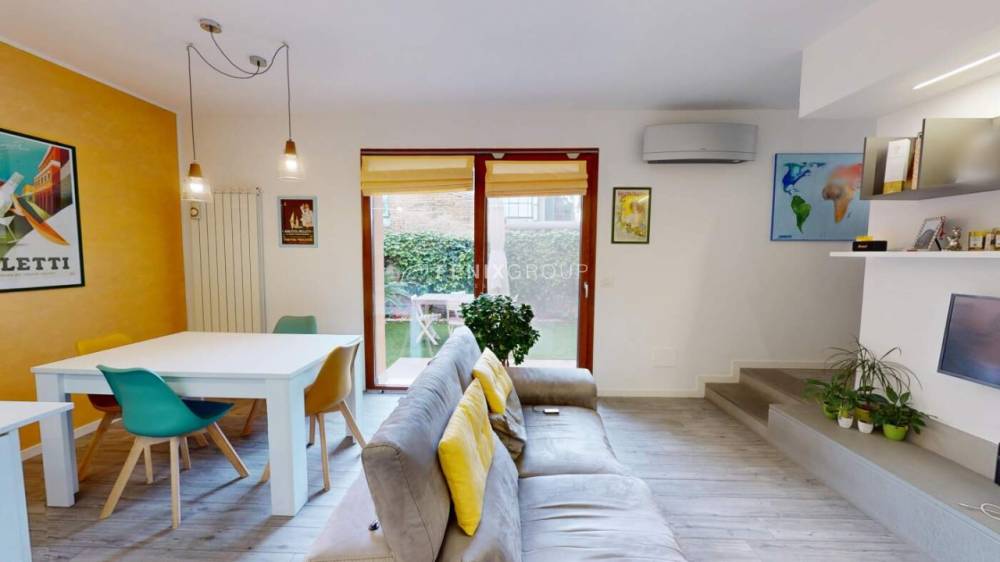 L’ingresso conduce a un ampio e luminoso soggiorno con cucina a vista, uno spazio accogliente e ben organizzato che si apre direttamente sul giardino privato di circa 34 mq.