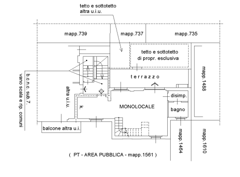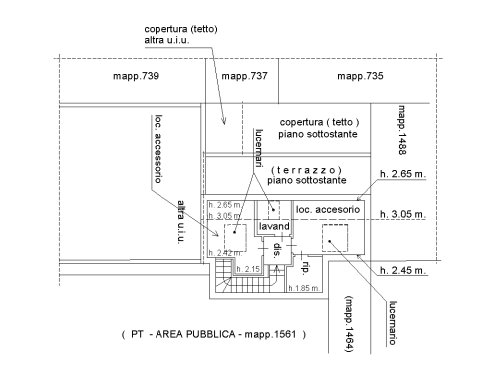 L'alloggio risulta caratterizzato dai seguenti locali: monolocale al piano secondo con disimpegno e bagno, oltre terrazzo al piano e ripostiglio esterno sotto falda di copertura. Attraverso scala interna di collegamento si accede piano terzo sovrastante composto da due locali accessori, ripostiglio e lavanderia.
