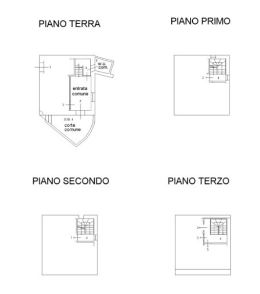 con parti condominiali a p. terra (corte, entrata, wc) e scala di collegamento ai