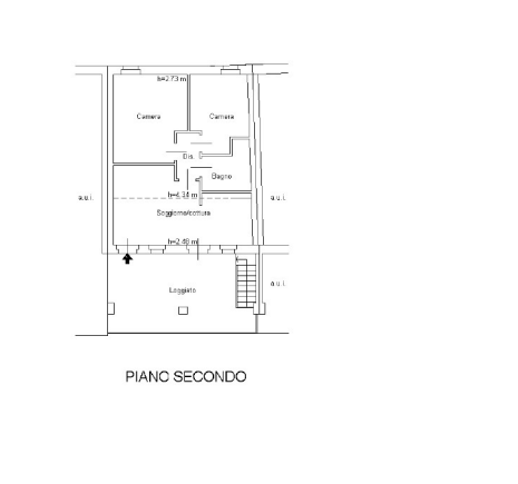 L'immobile è posto al piano secondo, con accesso da sola scala esterna, è così composto: loggiato, ingresso diretto in area soggiorno con zona cottura, disimpegno, un bagno con la sola presenza di un lucernario, due camere da letto.