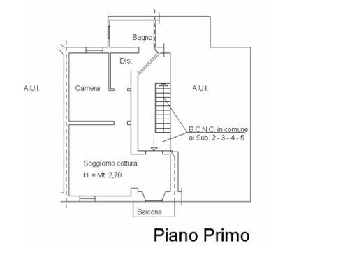 Immobile facente parte di un condominio composto da due piani fuori terra, per complessivi quattro unità abitative circa e parte di un'area pertinenziale esterna. L'appartamento si trova al piano primo è composto da una camera con balcone, un bagno, e un soggiorno/cucina.