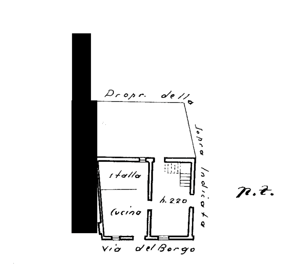 Fabbricato residenziale con annessa area scoperta su due piani situato a Povegliano (TV) in via Borgo San Daniele, composto da ingresso, una cucina, stalla, stanza al piano terra, granaio e stanza al piano primo.