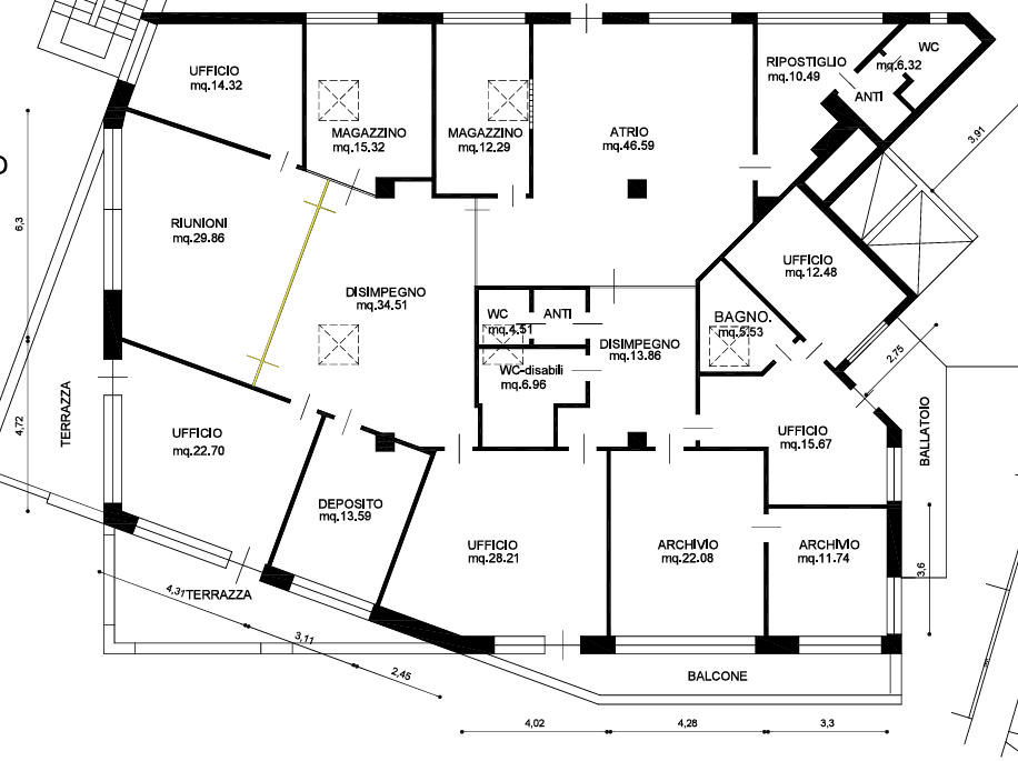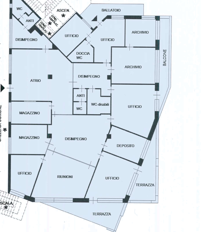 Ufficio situato a Bolzano (BZ), è collocato al terzo piano di un ampio edificio e ha una superficie di 389,00 mq. Internamente è composto da: un atrio di ingresso, 5 uffici singoli, una sala riunioni, 3 bagni di cui uno per disabili, 2 sale archivi, 2 magazzini, 2 terrazze, 1 balcone e 1 ballatoio.