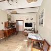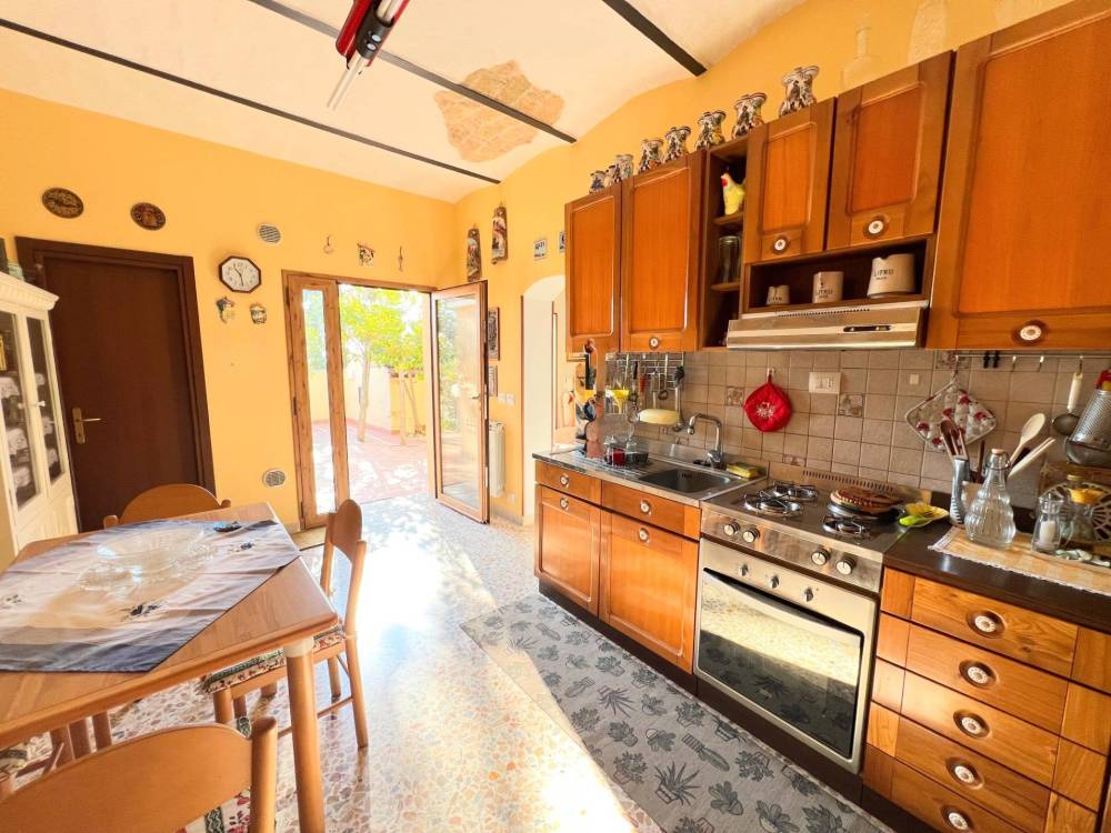 'Lingresso si apre sulla zona giorno, dove il camino e la cucina abitabile dialogano con la corte esterna, creando una bella armonia tra dentro e fuori, il piano terra è inoltre servito da un bagno/lavanderia.