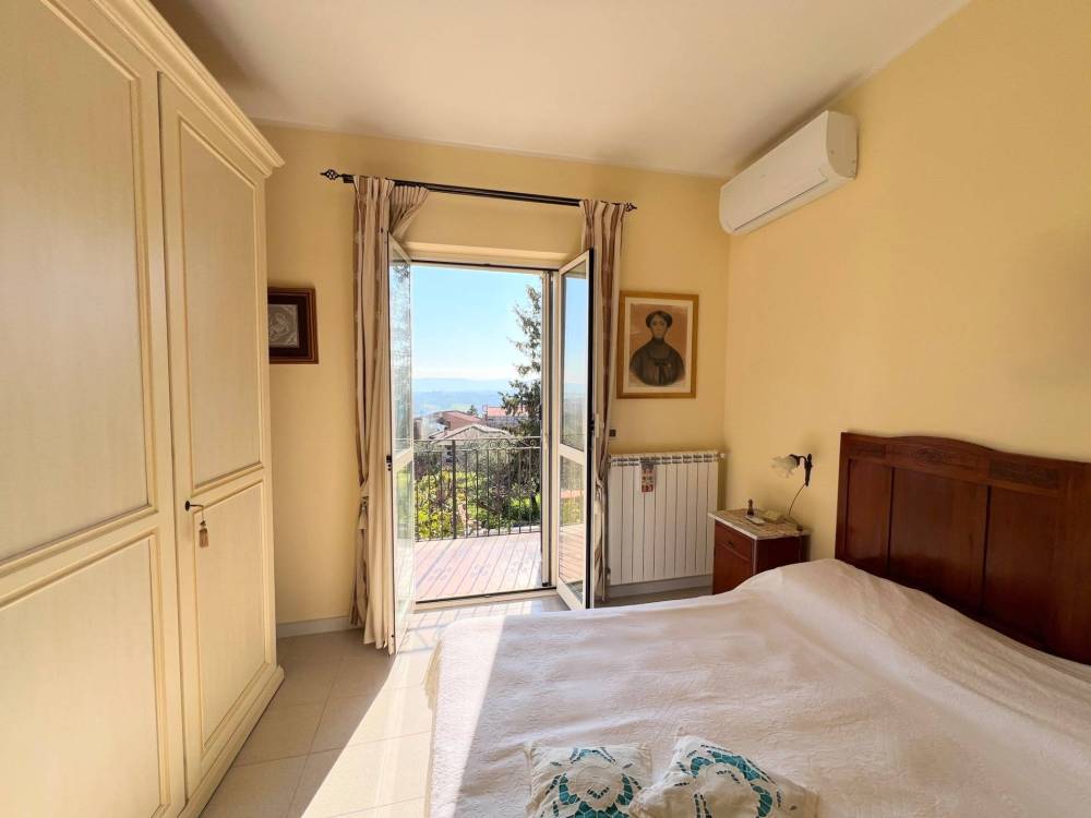 Al piano superiore, la zona notte composta da due camere matrimoniali e da un bagno si allunga su un balcone panoramico che guarda il borgo e le sue colline.