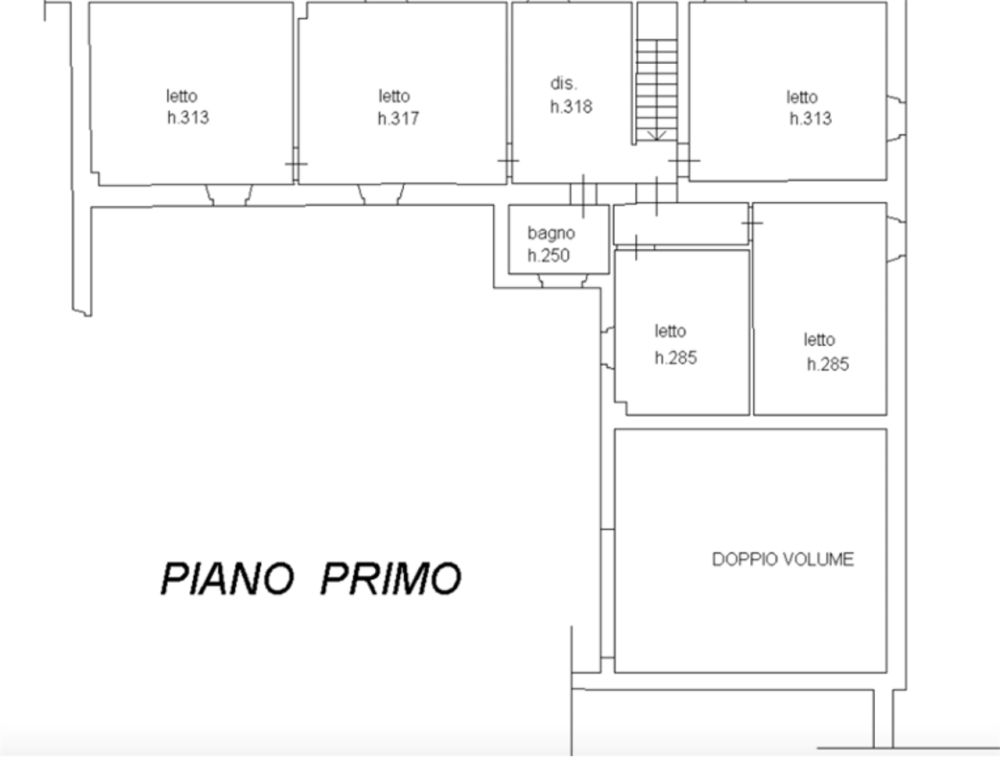 Il piano terra è composto da cucina, sala, ingresso, w.c. e due vani ad uso servizi (lavanderia e cantina). Il piano primo, destinato a zona notte, ospita cinque camere da letto, un bagno e un disimpegno.