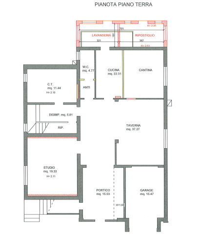 L'abitazione è composta da un piano terra in cui sono stati ricavati gli accessori oltre il garage e da un piano primo che contiene l'abitazione vera e propria. Al piano terra presenta un portico, una taverna, una cucina, un wc, una centrale termica, disimpegno ed uno studio. Al piano primo si trovano un ingresso, un soggiorno, tre camere, un bagno, un corridoio, una cucina ed il