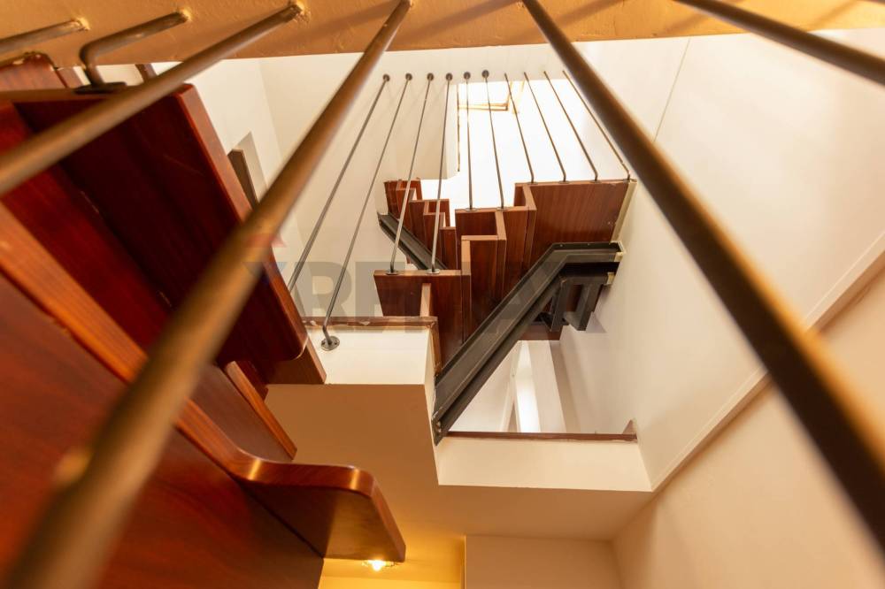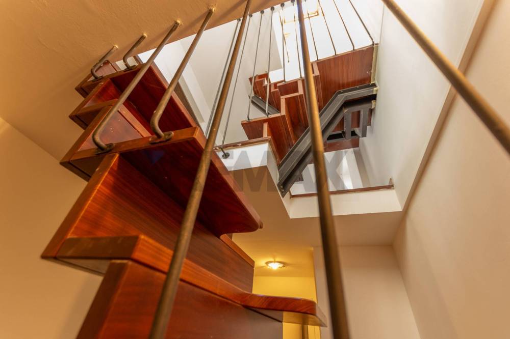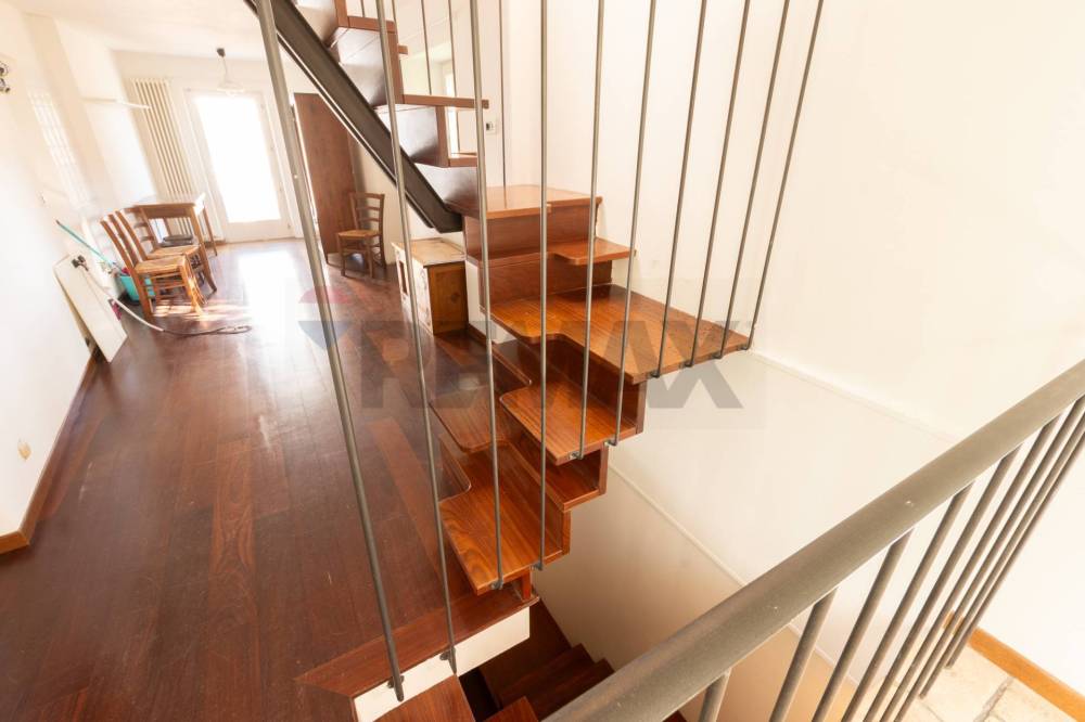 Una scala autoportante in legno massello, dal design elegante e funzionale, conduce alla zona notte.