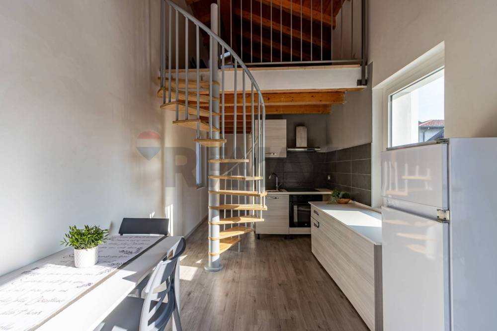 Lingresso si apre su una spaziosa zona living inondata di luce, dove il moderno angolo cottura si sposa con il calore delle travi a vista. Il vero tocco di classe è dato dalle doppie altezze: una scala conduce al soppalco a vista, un ambiente intimo e raffinato dedicato alla camera matrimoniale. Completa la proprietà un bagno e un balcone privato.