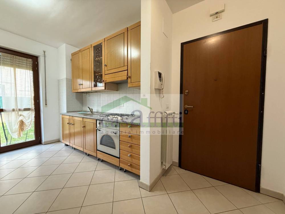 soggiorno-pranzo con angolo cottura e uscita sul giardino
