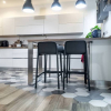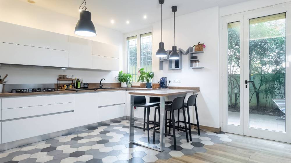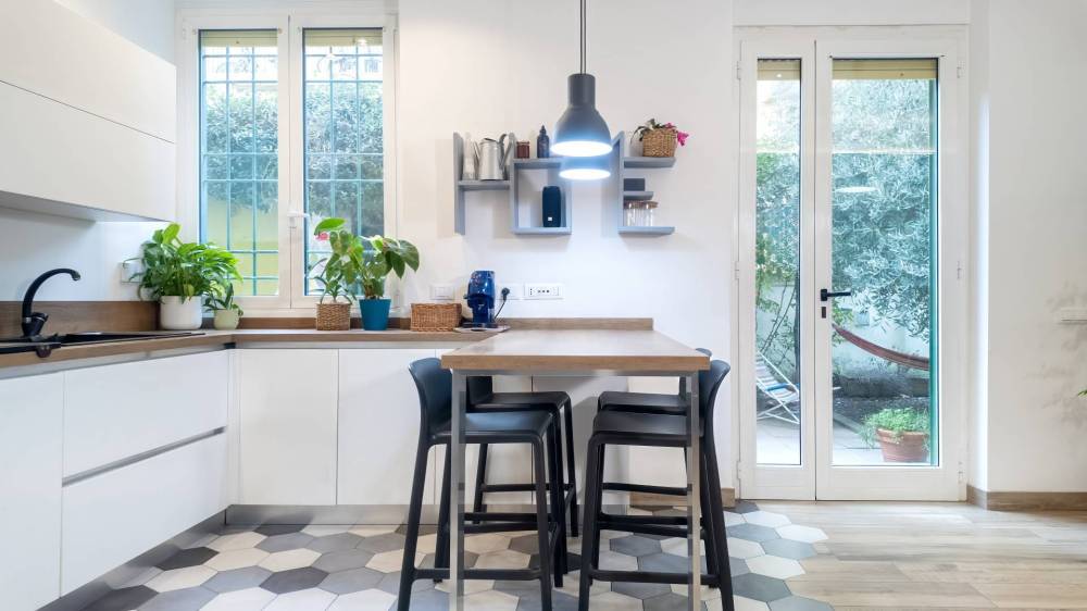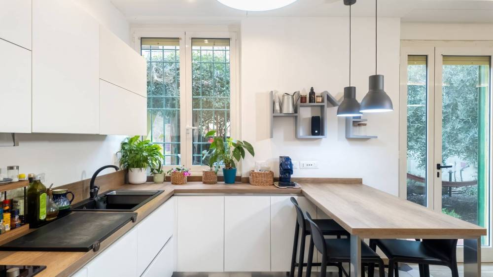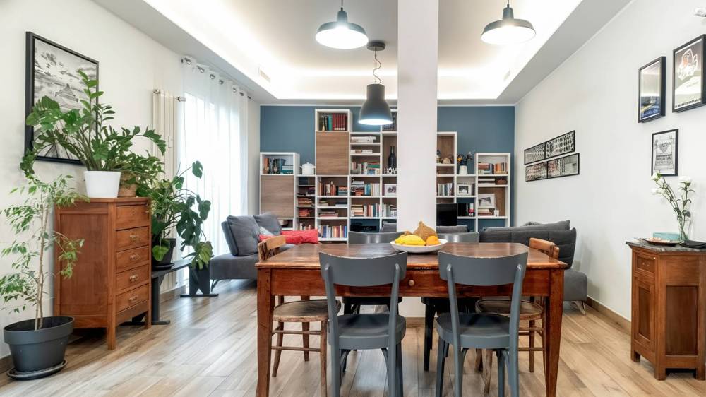 Lingresso conduce a un salone abitabile luminoso, perfettamente integrato con la cucina a vista, creando un ambiente conviviale e contemporaneo.
