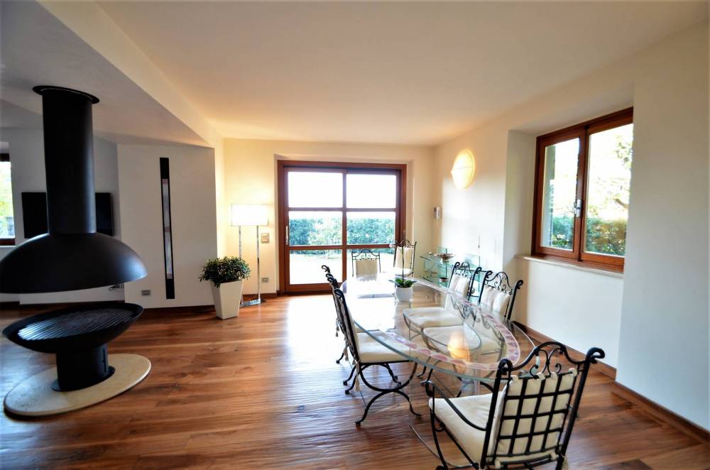 Al piano terra la zona living composta da un ampio doppio salone dove al centro si trova un camino dal moderno ed elegante design che divide l'ambiente nella parte destinata a sala da pranzo e in quella del soggiorno.