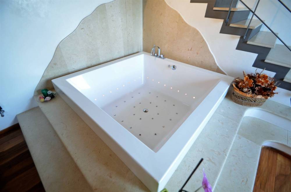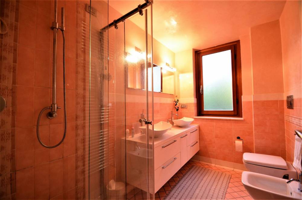 Al piano superiore si trovano 3 luminose camere da letto con 2 terrazze, la loggia, un ingresso/disimpegno e 2 bagni di cui uno di grandi dimensioni (18 mq) con vasca idromassaggio e accesso tramite scala al soppalco in muratura dove si trova la sauna finlandese, la zona relax e 4 spazi soffitta.