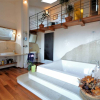 Una grande porta finestra permette l'accesso dal resede esclusivo della villa e contribuisce assieme ad altre 2 grandi finestre a rendere l'ambiente estremamente luminoso; una scala in metallo e marmo conduce al piano superiore dove si trova la zona notte.