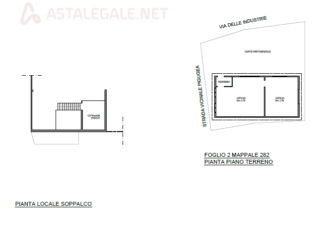 B. Laboratorio artigianale, con piccola corte pertinenziale, il tutto della superficie commerciale di 63,60 mq, attualmente adibito ad ufficio, composto da un unico piano fuori terra suddiviso internamente in due locali attraverso una tramezza.