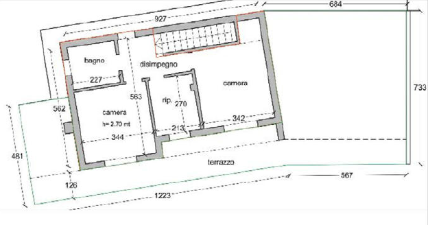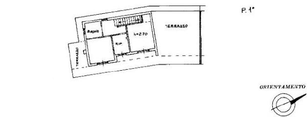 Dalla sala-ingresso, tramite una scala interna, si raggiunge il primo piano adibito a zona notte e composto da due camere, un bagno e un ripostiglio.